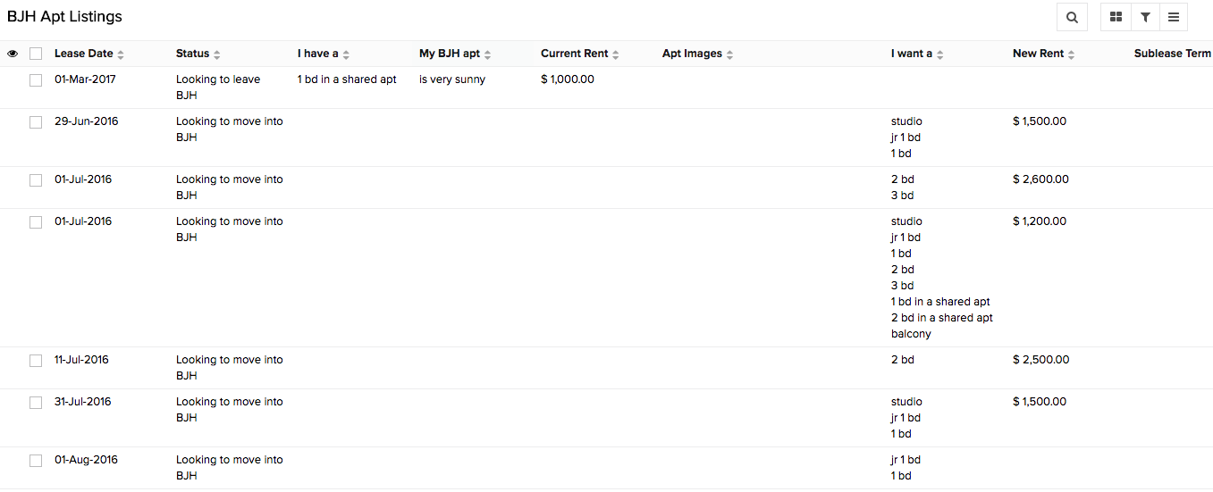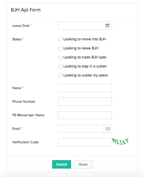 BJH Apartments is a web-application that helps prospective tenants learn of openings to move into the BJH Apartments and also helps current tenants swap apartments or find replacement tenants. The landing page is made with WordPress and the database is powered by Zapier.