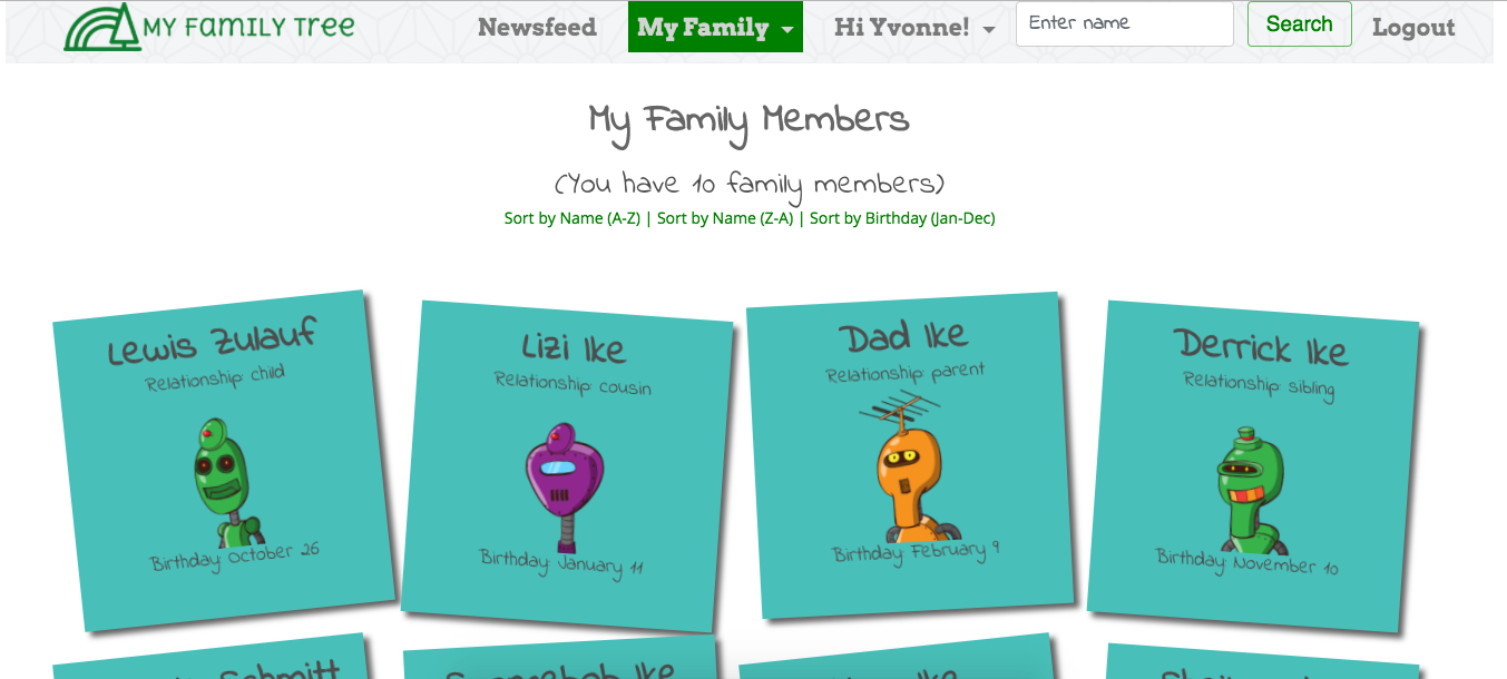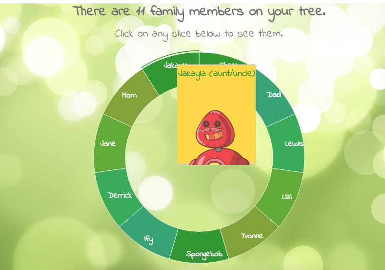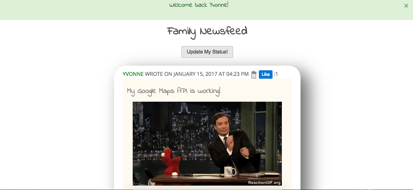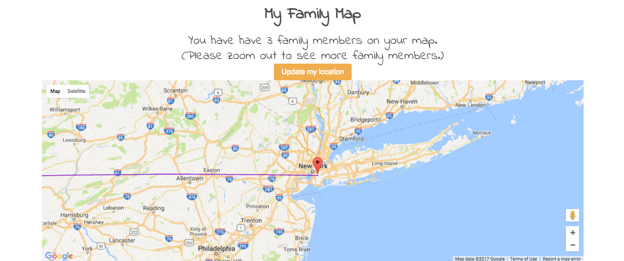There is a Google Charts API visual representation of each family member on a “family tree” and a Google Maps API to show each family member's geo-location on a map. I chose to build this app because I have a large extended family and thought this would be a fun way to allow technology to act as a historian while allowing families to keep in touch in a more private and secure setting.